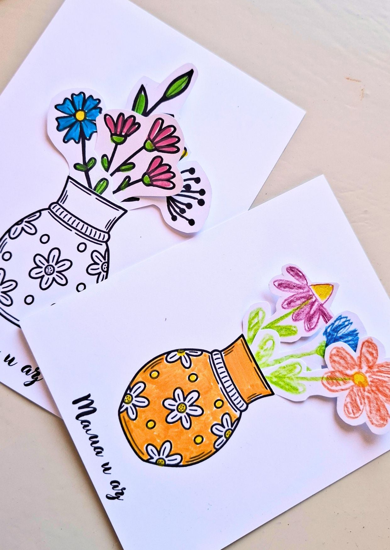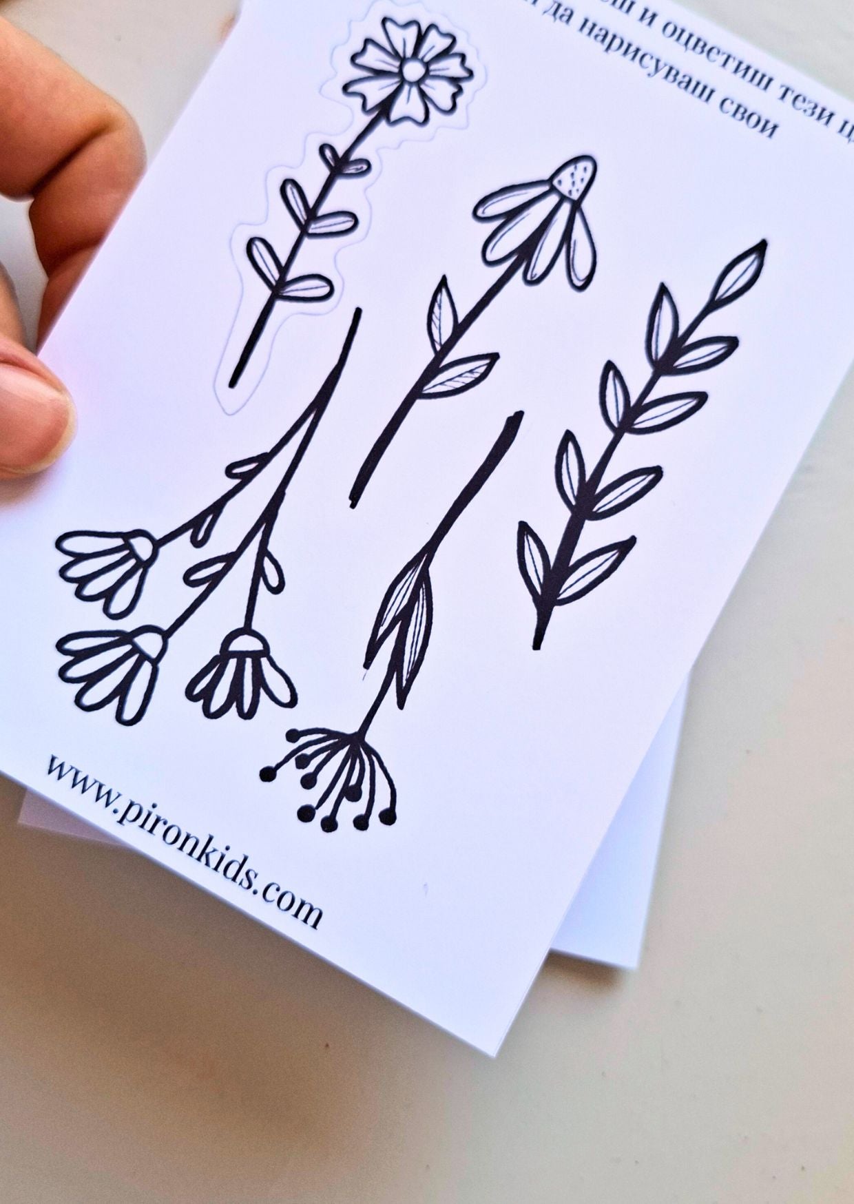 Към всяка картичка получаваш лист с разпечатани цветя, които можеш да оцветиш и изрежеш.