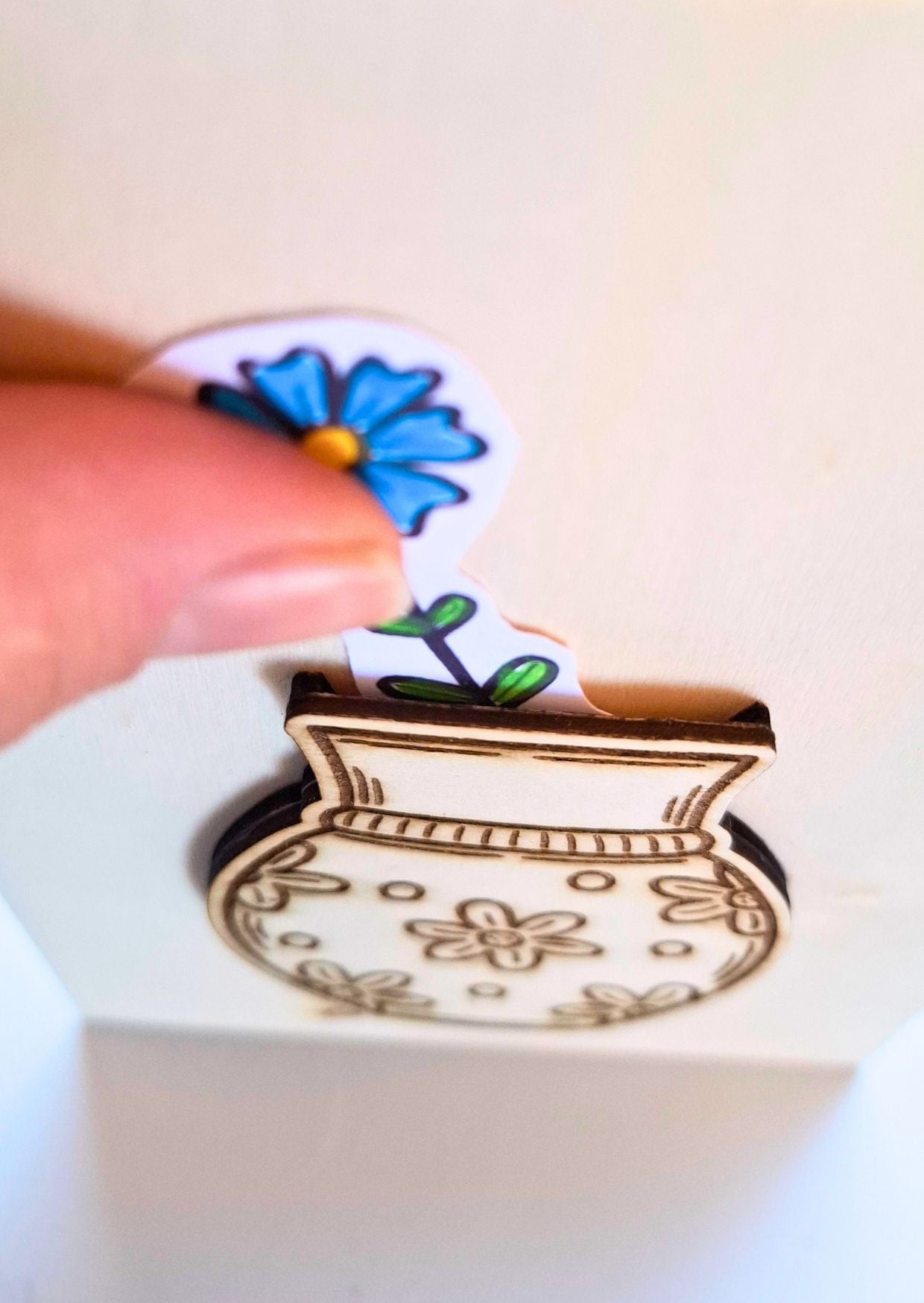 Картичката е с ваза, в която могат да се поставят цветя – нарисувани, оцветени, изрязани или измислени от теб.